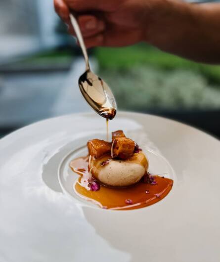 orange reduction sauce / cauliflower puree with herbs, almonds and garden mint