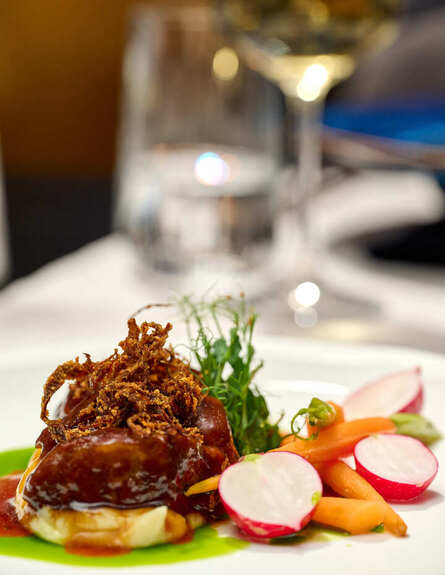 Policzek wieprzowy długo duszony w sosie jałowcowym